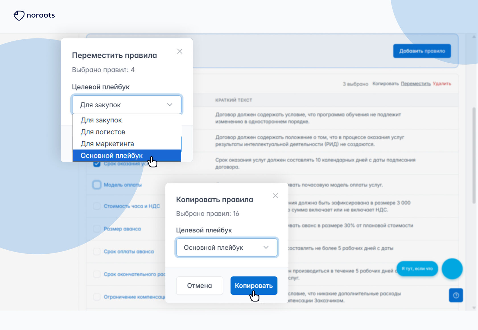Правила можно переносить и копировать между плейбуками. Это упрощает сборку новых сценариев: можно взять базовый набор и дополнить его под конкретный тип договора или задачу.