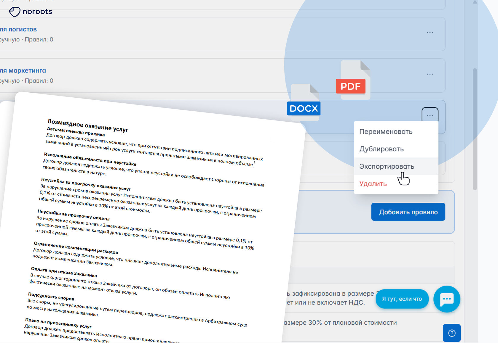 Плейбук можно выгрузить в PDF или DOCX. Это удобно для согласования внутри команды, передачи внешним юристам или фиксации правил как внутреннего стандарта.