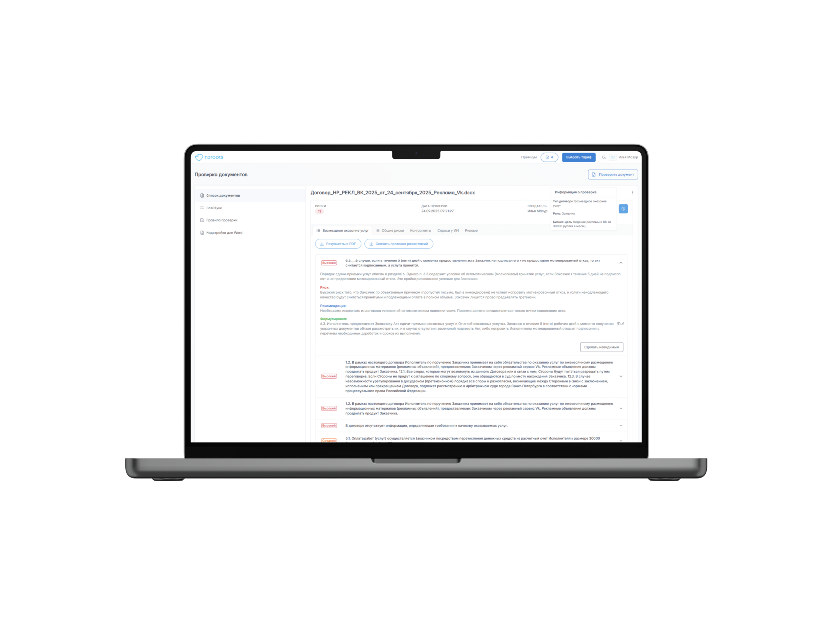 - Сервис автоматически выявляет ошибки и несоответствия в договоре, подсвечивая их и давая рекомендации по устранению. Вы получаете подробный отчет с местами, требующими коррекции.