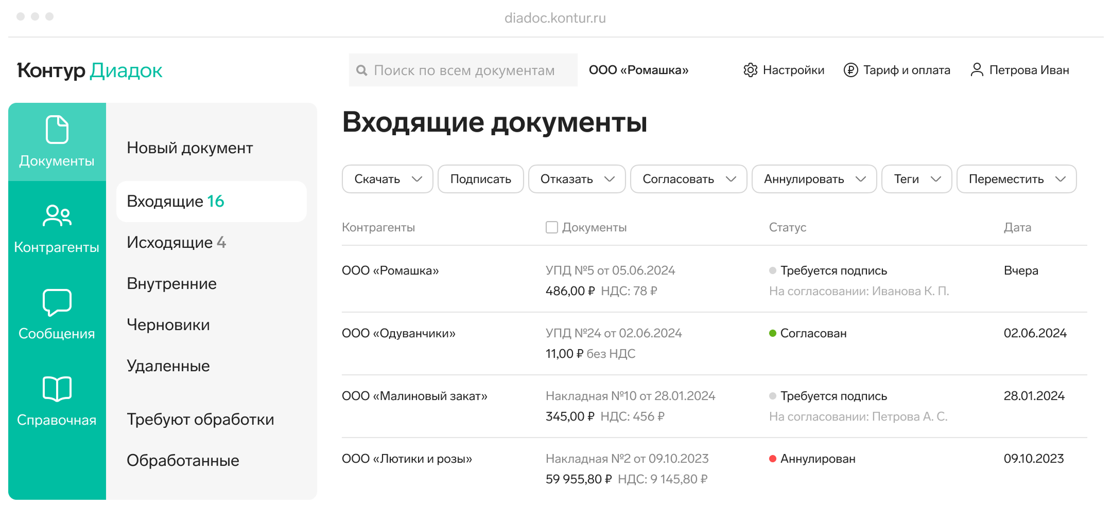 Контур.Диадок — сервис для обмена юридически значимыми документами между организациями. Обеспечивает быстрый и безопасный обмен счетами-фактурами, актами, договорами и другими документами, интегрирован с бухгалтерскими системами (1С, SAP и др.).