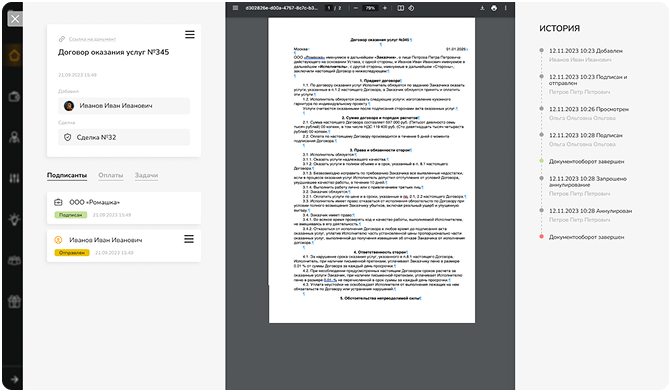 - Функциональность и простота использования. Есть поддержка множественных подписантов, отслеживание статуса документов, интеграция с ERP-системами, CRM и прочими используемыми в компании приложениями.