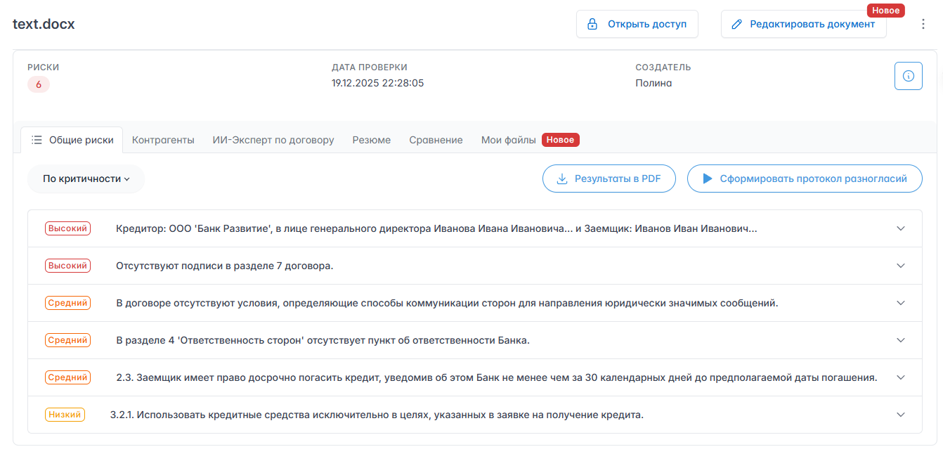 Автоматический анализ кредитного договора с Noroots позволяет проверить юридический документ без ручного изучения каждого пункта. Система проводит экспертизу текста, выявляет потенциальные ошибки, спорные формулировки и условия, которые могут повлиять на права заемщика.