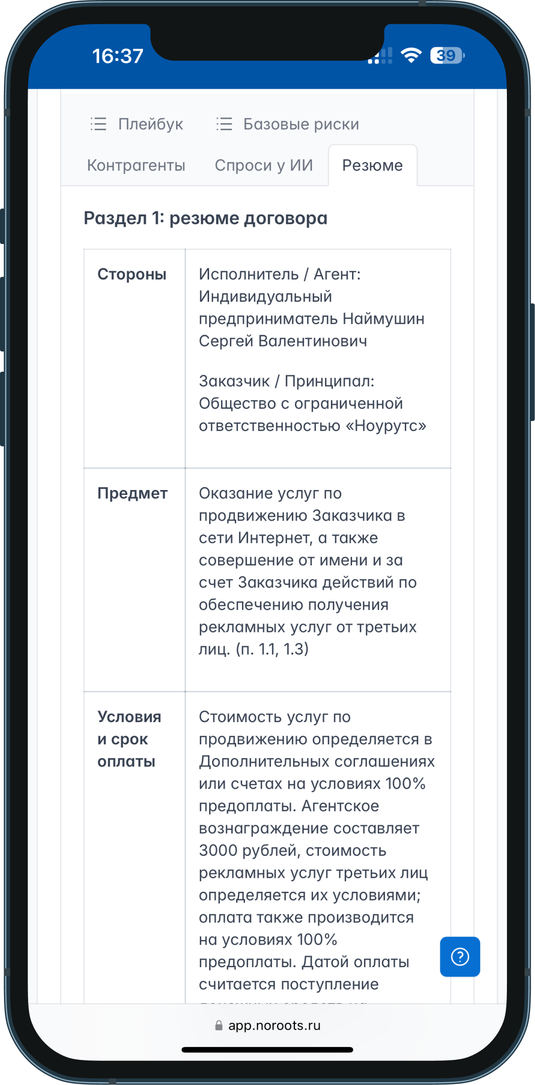 Я с помощью джпт сформулировала основные тезисы, которые мне нужны в договоре, а потом уже полный договор загрузила в noroots и это был восторг: все тонкие места / неправильные формулировки он мне подсветил и дал конкретные рекомендации: в чем риск моей формулировки и формулировку, которую стоит вставить.